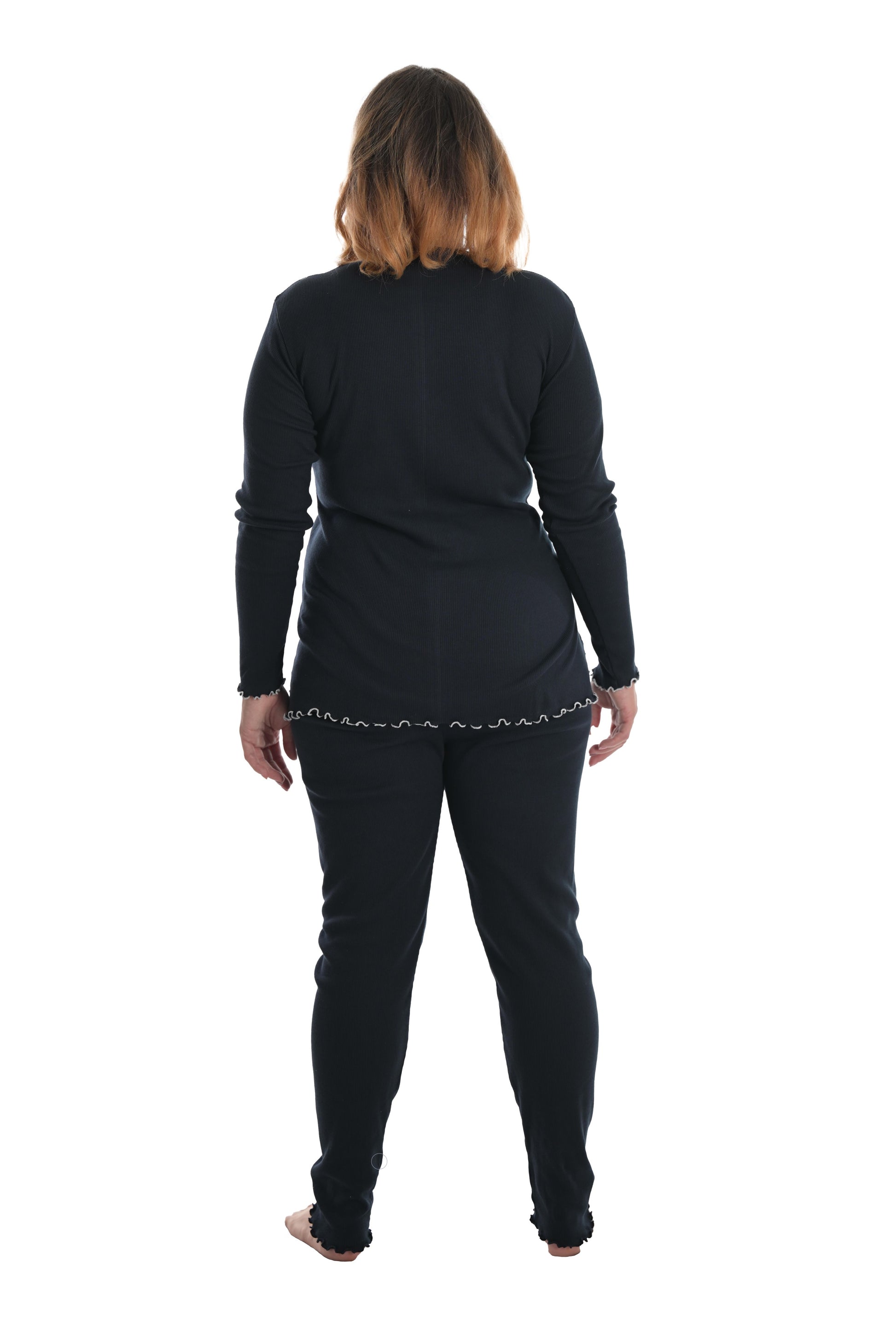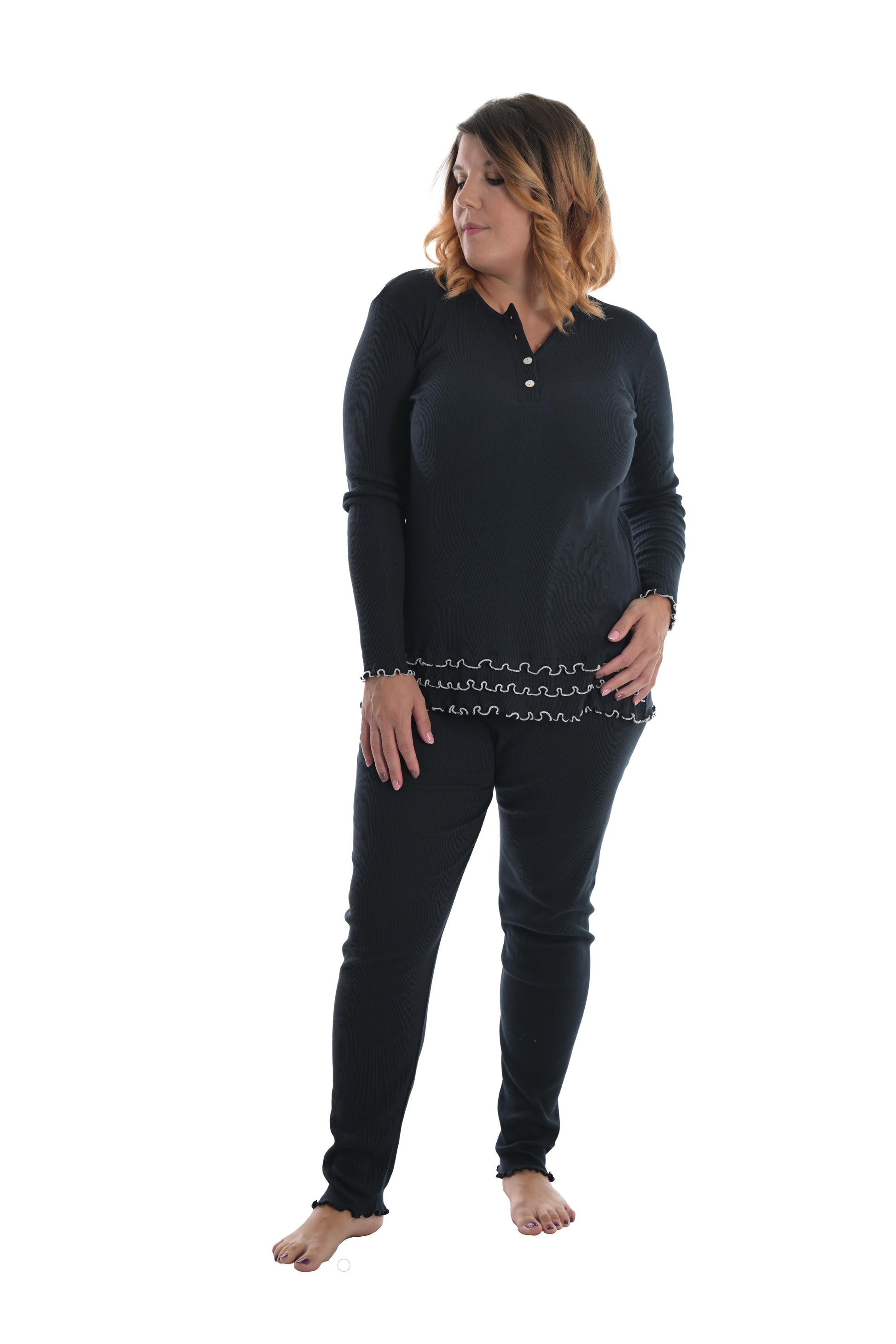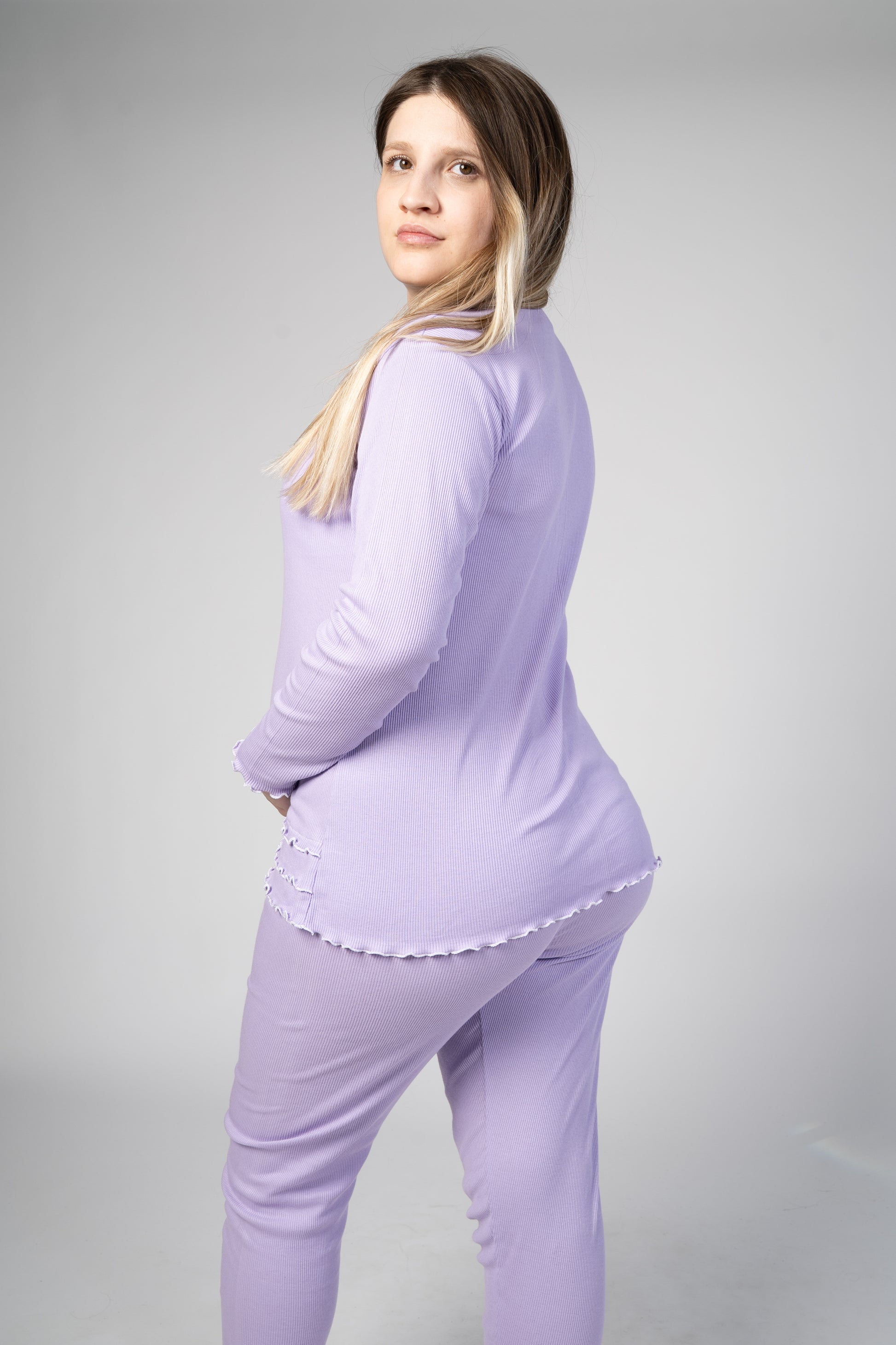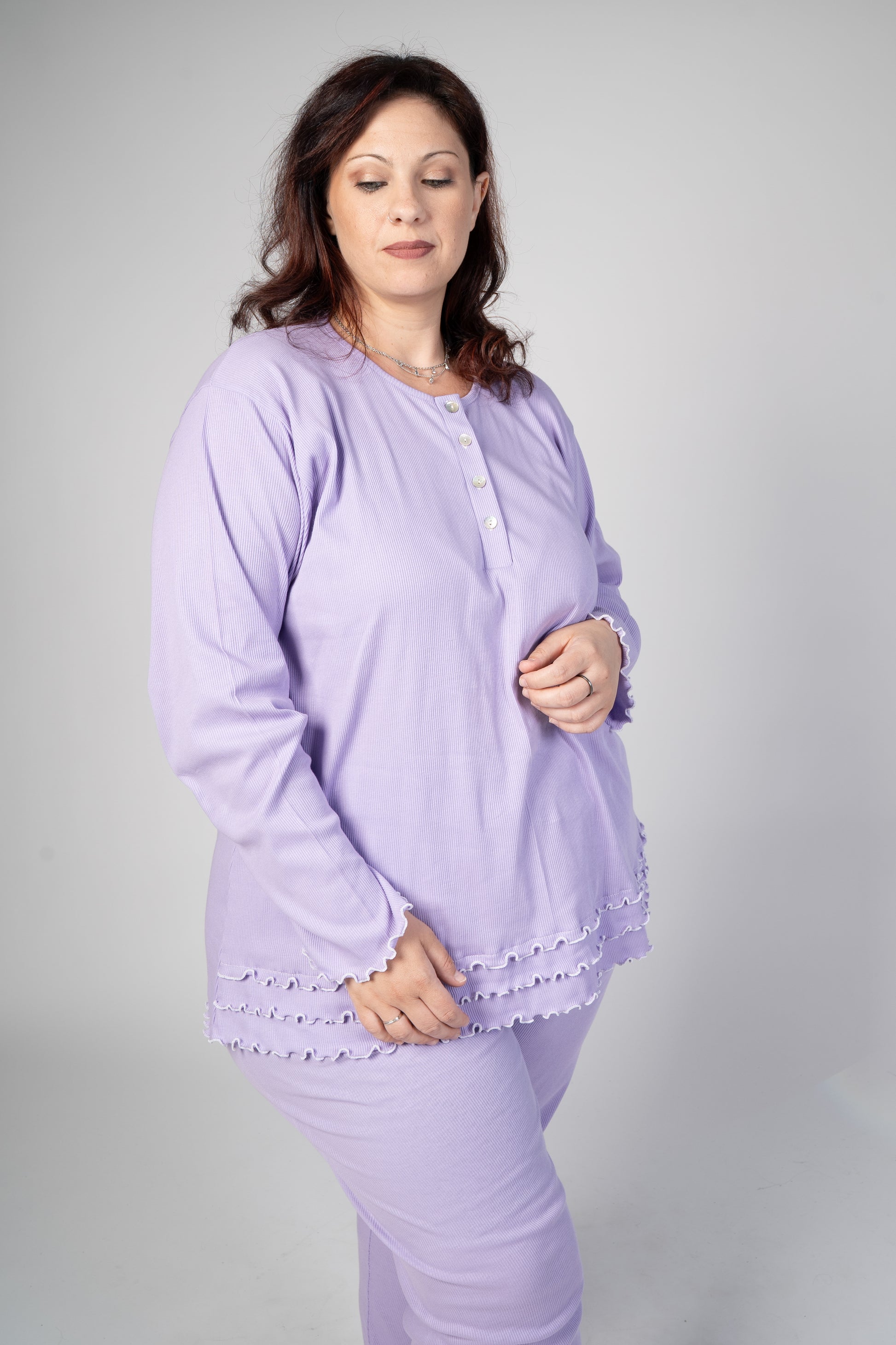 Scollo a girocollo con profonda abbottonatura. Adatta per allattamento. Motivo con 3 volants nella parte frontale. Orli a frullino